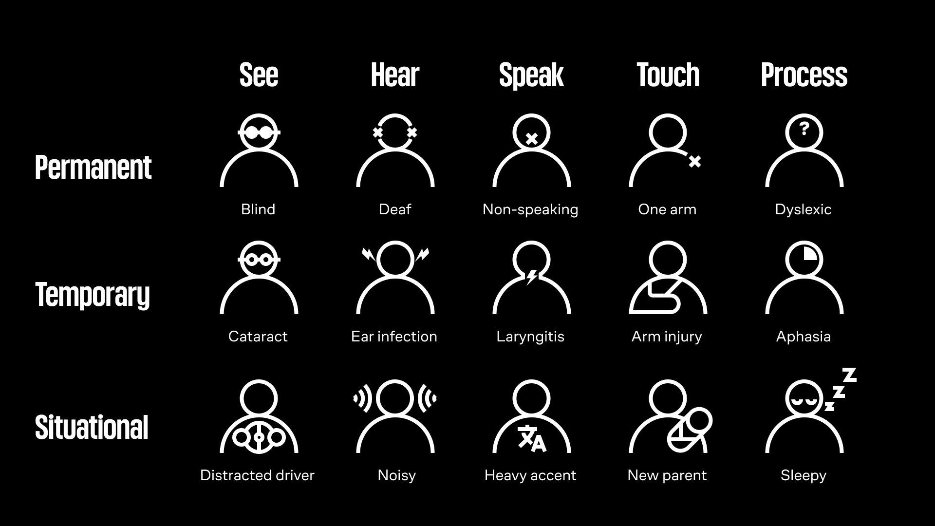 People with disabilities represent a very diverse group, including those with visual impairments (blindness, low vision, color blindness), hearing impairments (partial or total deafness), motor or mobility impairments (limited hand or arm use, difficulty with fine motor control), cognitive and learning disabilities (dyslexia, memory limitations, ADHD, intellectual disabilities), as well as speech impairments, chronic health conditions, and mental health disorders.