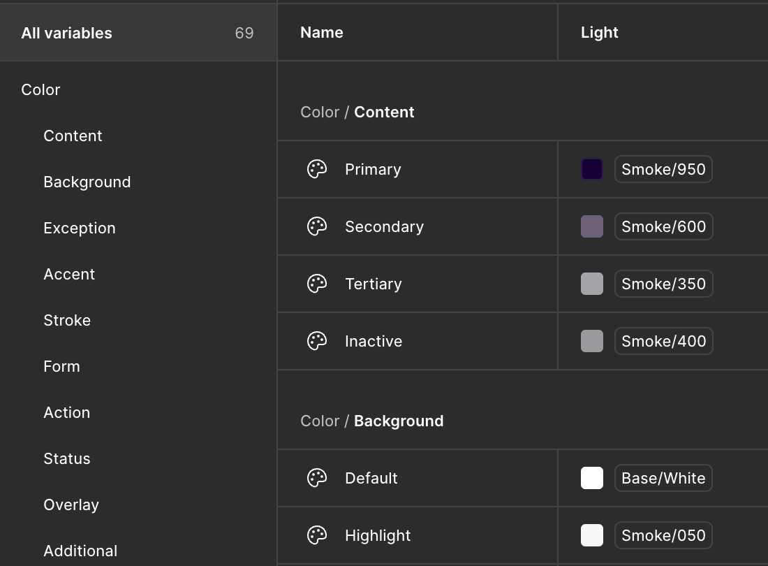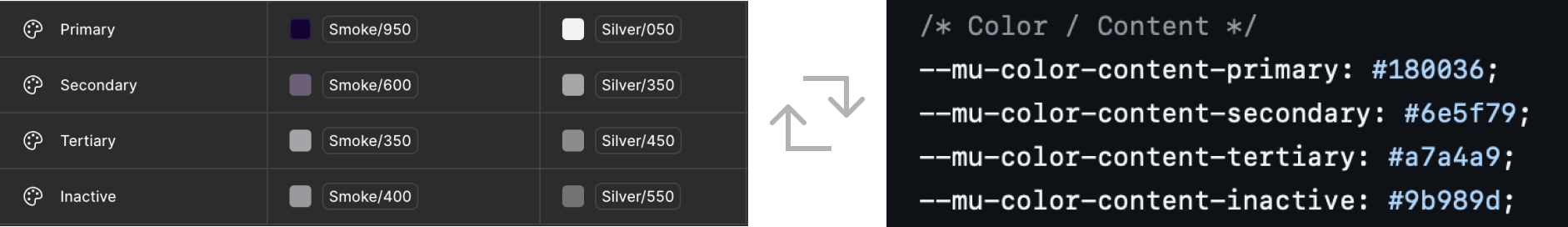 An example of semantic tokens is Smoke/950, which is taken from the Foundation via an alias. ContentPrimary serves as a product semantic token.